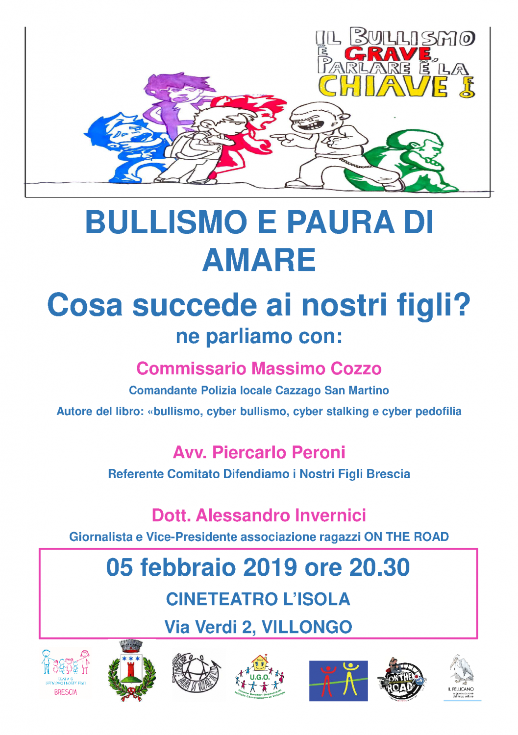 Parliamo di Bullismo con il Commissario Angelo Cozzo (Comandante Polizia locale di Cazzago San Martino), con l'Avv. Piercarlo Peroni (Referente Comitato Difendiamo i nostri figli di Brescia) e con il Dott. Alessandro Invernici (vice presidente associazione ON THE ROAD).